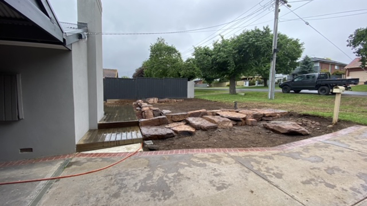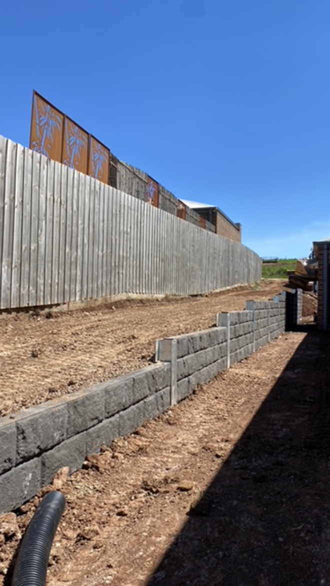 The equipment we have at our disposal enables us to create a natural style retaining wall built by moving existing earth into form and then adding a range of rocks, this type of retaining wall suits rural properties as it offers low to no ongoing maintenance, whilst aesthetically it adds a natural looking flow to the area whilst serving a purpose.